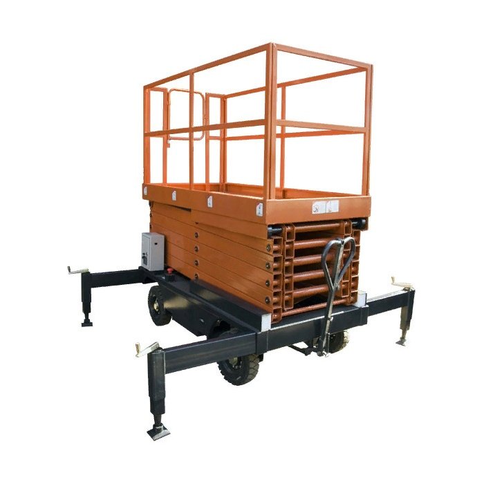 Облегчают перемещение подъемника поворотная передняя ось и рукоятка, в которой также имеется отверстие для сцепления с буксирующим транспортным средством. Защитные ограждения на платформе ножничного подъемника делаются съемными, что позволяет при необходимости уменьшить габаритную высоту и облегчить транспортировку и хранение оборудования.